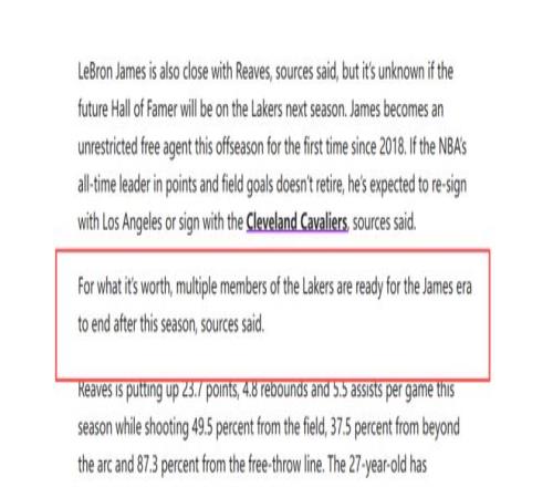 數(shù)名消息人士向其透露,湖人內(nèi)部多名成員已經(jīng)做好了本賽季后迎接詹姆斯時代終結(jié)的準備。