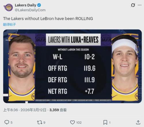 Lakers Daily今天又曬出一組數(shù)據(jù):本賽季當詹姆斯缺席,東契奇和里夫斯同時出戰(zhàn),湖人10勝2負,勝率高達83.3%。這12場比賽,湖人進攻效率119.6,高居聯(lián)盟第三;防守效率111.9,聯(lián)盟第六;凈效率+7.7,同樣是聯(lián)盟第三。