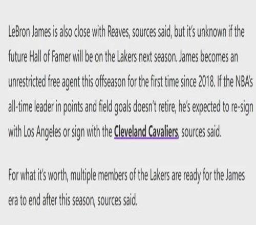 Ashish Mathur在報道中透露,多位湖人球員和管理層已經(jīng)做好準備,在今年夏天迎接詹姆斯時代的終結(jié)。昨天教主剛剛寫過,今年夏天,里夫斯跳出合同成為自由球員,詹姆斯的合同屆時也將到期,湖人管理層很難同時留下他倆。